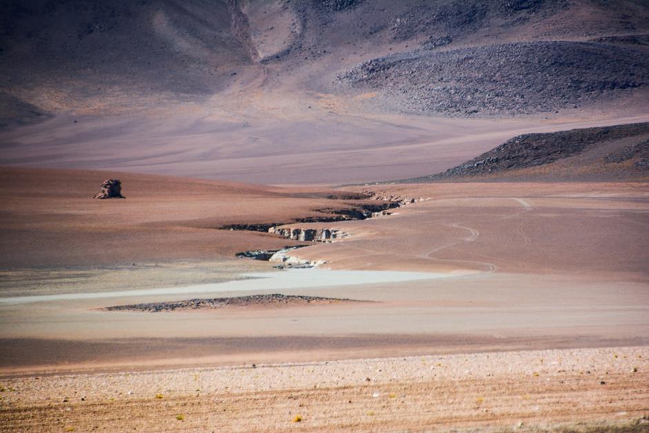 Bereits zu Sonnenaufgang kommen die nächsten Jeeps an. Noch ehe wir unser Zelt abgebaut haben stehen wieder 40 Jeeps vor dem Bad. Wir sind auf der Hauptstrecke der Lagunenroute angelangt und es fehlen nur noch wenige Kilometer bis zur chilenischen Grenze. Für uns noch zwei Tagesetappen aber für die Autos ist es nur noch ein Katzensprung. Auf der Piste ist den gesamten Tag relativ viel Betrieb in beide Richtungen. Während wir uns zur Dali-Wüste vorarbeiten sind wir ruck zuck wieder in eine Staubschicht gehüllt. Bad von gestern Ade...Die Dali Wüste wird nach dem gleichnamigen Künstler benannt denn der Blick auf diese surreale Landschaft könnte ebenso einem Blick auf eines der Dali-Gemälde entsprechen.