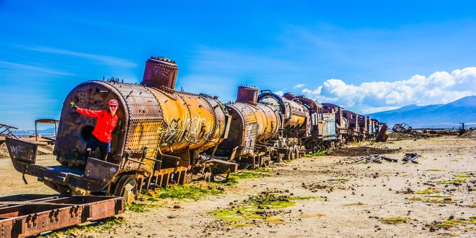 Wir radeln also mit den schwerbepackten Rädern los. Unser Weg führt uns als erstes zu einer Kuriosität, nur wenige Kilometer außerhalb der Stadt Uyuni, dem Eisenbahnfriedhof. Hier stehen an die 100 Lokomotiven, Wagen und Kessel aus vergangenen Zeiten und bieten dem Touristen und Einheimischen eine interessante Mischung aus Altmetallersatzlager, Abenteuerspielplatz und open air Kunsthalle.