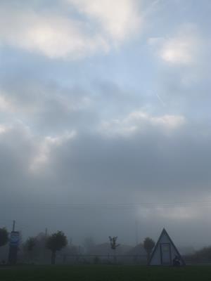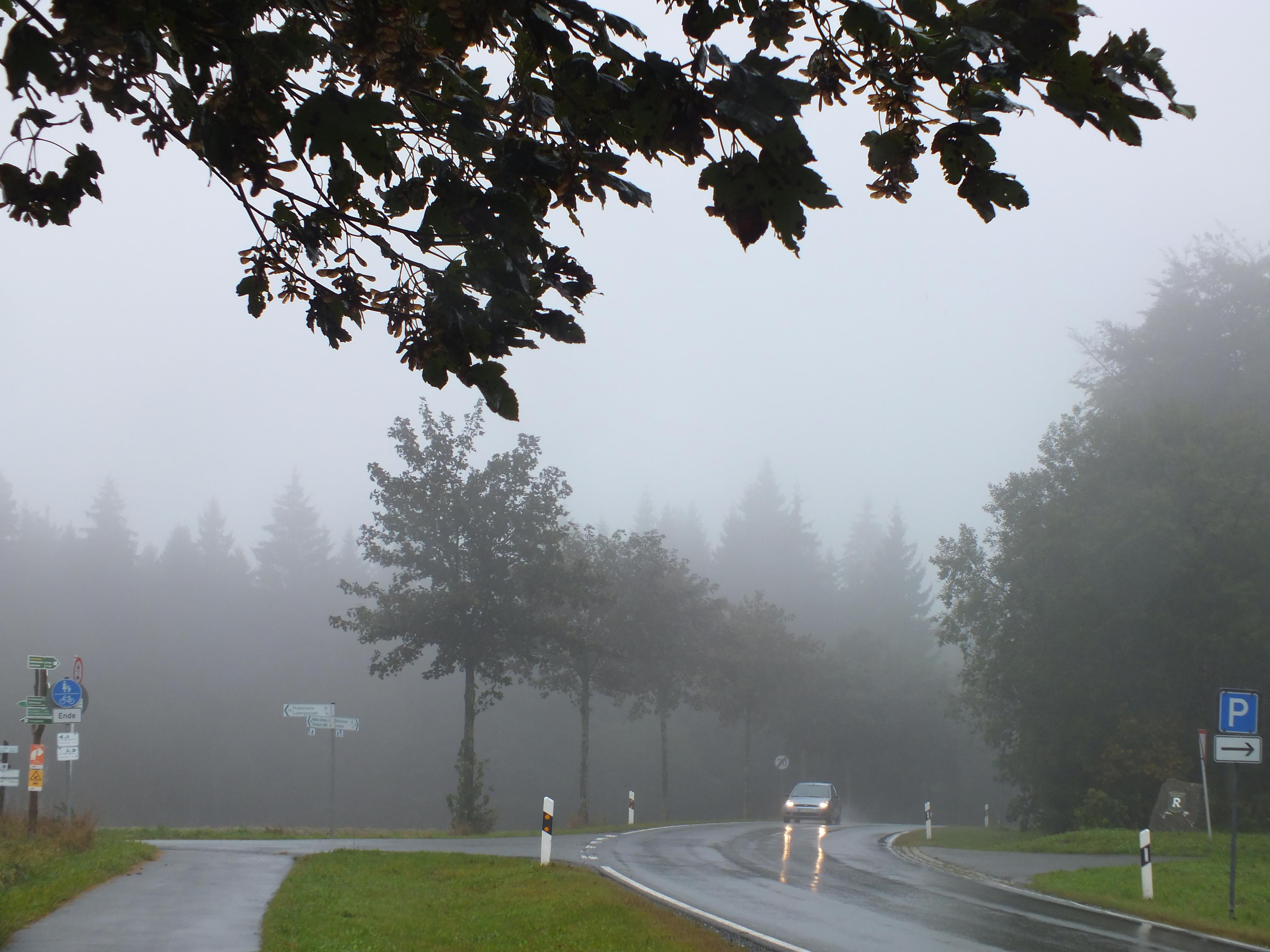Während der nächsten Strecke durch den Fränkischen Wald begrüßt mich der Herbst mit Temperaturen von ca. 13Grad und leichtem anhaltendem Nieselregen. Auf ca. 700 meter üNN. ist die Sicht zusätzlich durch starken Nebel so schlecht, das mir sogar die Streckenbeschreibungen (am Windrad rechts abbiegen) schwer fallen.