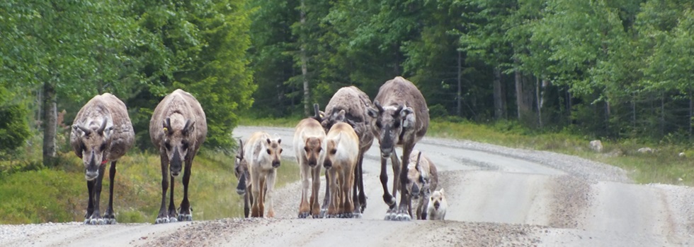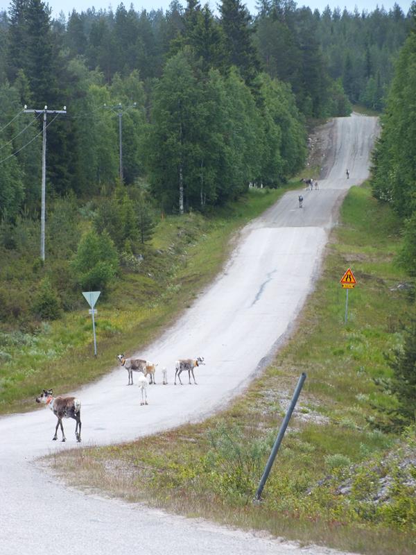 Aber die Mücken haben auch Spass an der Wärme, sie werden mehr. Jetzt ist es noch auszuhalten. Da der Camping kurz vor Ruka liegt radele ich ganz ruhig durch den leer-gefegten Ort. Die separate Beschilderung nur für die Schnee-mobile faszinieren mich. Es muss im Winter hier bestimmt sehr gemütlich sein. Auf der Weiterfahrt Richtung Kuuoma, stoppe ich in einem kleinen Souvenirgeschäft, das am Wegrand mit einem Schild die Touristen anlockt: „Kahvi ja pulla“ Kaffee mit Gebäck/Teilchen/Stückchen für 2€, das ist wirklich nicht viel, in Norwegen kostete ein Kaffee meist 4-5€. Kurz nach Kuuoma, wird die Route dann unbefestigte Schotterpiste für 20km, aber besser als angenommen zu befahren. Dort kann ich sehr schöne Aufnahmen von Rentieren und sogar einem Fuchs machen. Die Rentiere sind sehr Neugierig und dennoch scheu. Sie kommen immer erst auf mich zu und bei der Unterschreitung von ca. 100m Sicherheitsabstand“ stellen sie erst die Hinterläufe breit auseinander und flüchten dann in den Wald.