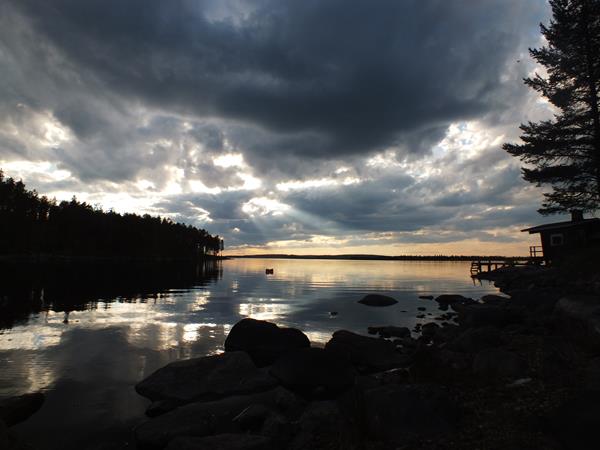 Der Abend am See bei Suomusslami ist sehr schön, einige Wolken machen den Himmel sehr ansehnlich, da die nicht untergehende Sonne ein Schauspiel mit den Sonnenstrahlen und der Ruflektion im Wasser macht.
