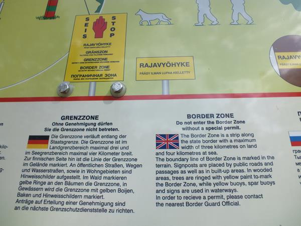 Anders als in der Beschreibung über den Verlauf der weiteren Strecke ist es nicht flach sondern sehr hüglig mit kleinen Anstiegen bis zu 10 oder 14%. Von dieser Straße sind es links der Strecke ca. 8km Luftlinie bis zur Russischen Grenze, auf einem Schild ist eine kamera abgebildet, mit Schriftzug „Rajavartiolaitos“ darunter. (entweder filmen erlaubt oder verboten) ich fotografiere das Bild um später nachzufragen. Die Nachfrage ergibt weder eins noch das andere.
