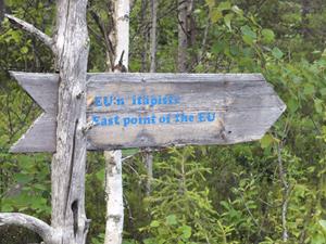 Nachdem Johanna und Georg eingetroffen sind drehen wir noch eine Runde zum Museum, wobei an dem harten Anstieg auf Schotterpiste die Ketten von Johanna reist. Shit!!! Unter den nervenden Einfluss der Mücken kürzen wir die Kette und können weiter in Richtung „Östlichster Punkt der EU“ fahren. 17Km auf unbefestigtem Schotter und wir stehen direkt bei der kleinen Insel, die den Eckpunkt im Winkel von 52° zwischen Finnland und Russland bildet. Es stehen drei Pfosten, weiß- blau für die Finnishe Seite, rot-gelb für die Russische Seite und dazwischen der Grenzpfosten in weiß. Mein Idee rüber zu schwimmen und meine kleine Fahne auf den weißen Pfosten auf Vollmast zu setzen lassen wir dann lieber, wer weiß ich möchte ja noch rüber aber nicht hier und mit Offiziellen und Grenzübergang. In der nahe-gelegene Hütten verbleiben wir, machen ein schönes Lagerfeuer und grillen Würstchen, dazu Bratkartoffel und das Abendessen ist perfekt. Die Nacht verbringen wir in der gepflegten Hütte, sogar Tischdecken gibt es hier.