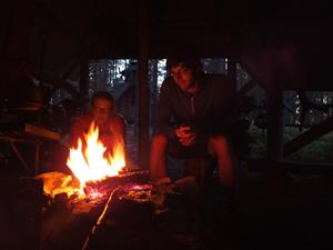 Am Abend bleibe ich bei wärmendem Lagerfeuer in der Hütte.
