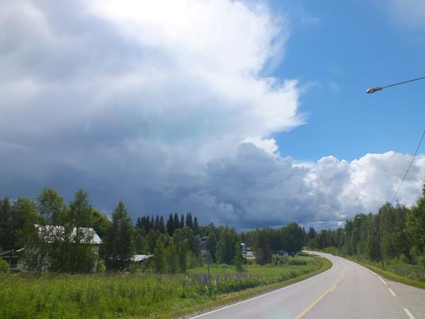 Morgens frühstücken wir beim Lagerfeuer, kochen wasser über der flamme für kafee und Tee. Dann müssen wir aber -da die strecke eine Sackgasse ist, die 17km Schotterweg wieder zurück. In Hattuvara, gehen wir wieder großzügig im kleinen Laden shoppen, denn die Sonne heizt heute gut ein. Erstmal ein Eis, bei ca. 20 Grad -huuhuuuuu- ist es heute morgen schon warm. So wirklich kommen wir nicht los, …. einen kaffee mit (auf deutsch) Pfannekuchen/Eierkuchen hält uns noch eine Stunde an dem schönen Platz in der Sonne. Wir beobachten zwei recht große Gewitterwolken, können aber nicht deren Bewegungsrichtung feststellen. Wir beschließen loszufahren. Nach ca. 15km an einem Anstieg reiß leider an einer anderen Stelle nochmal Johannas Kette und wir nehmen nochmal ein Stück heraus. Während dem gefrimel merken wir nicht, dass das Gewitter richtig am toben ist. Lediglich einige Donner sind zu hören. Wir starten los, genau in Richtung dunkle Wolken. Dass es sich um eine richtige Gewitterzelle handelt, wussten wir nicht. Nach ca. 5km, wurde die Temperatur unangenehm kalt, 12 _Grad nur, und es lang teilweise 10cm aufgehäuft der Hagen neben der Straße. Wir hatten sehr viel Glück nicht hineingeraten zu sein.