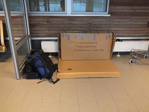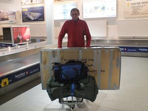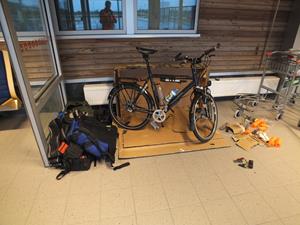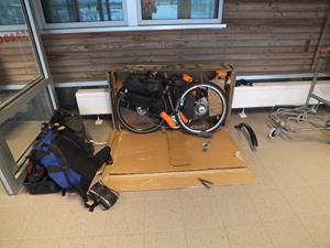 In nur drei Minuten an der Gepäckausgabe kommt tiefere Entspannung zum Vorschein. Meine Tasche und als letztes Gepäckstück aller Reisenden die Rad-Box, danach wird das Band abgeschaltet und die Mitreisenden verdünnisieren sich in Autos und Busse. Jetzt stehe ich hier, allein, draussen ist quasi kalter Herbst. Einen Bediensteten frage ich ob ich mein Rad zusammenbauen darf, er versteht kein Wort enlish. Kurz darauf schneide ich die Box auf und starte mit dem Zusammenbau.