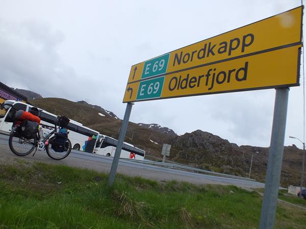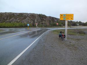 An dem folgenden Camping stoppe ich für ein Frühstück, wobei es sofort anfängt zu schneien. Ich überlege wegen den Wolken verhangenen Bergen, einen Tag hier unten zu bleiben oder das Nordkap auszulassen und von hier Richtung Kirkenes. Auslassen kommt nicht in Frage, hier übernachten wäre die Entscheidung zu früh am Tag, also versuchen und schauen bis wie weit hoch ich radeln kann. Immer wieder halte ich an um Kleidung auf oder zu zu machen oder auch Bilder von der schönen Landschaft zu schießen. Ein Schild steht am Wegesrand, 20km sind es noch, die Straße führt über ein Hochplateau, wobei der kalte Wind extrem stark drüber bläst. Zwischendurch immer wieder etwas Schnee unter dem Regen.
