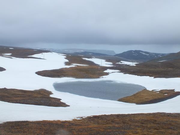Meine Reisegeschwindigkeit liegt unter 10km/h, der Anstieg bis zu 14% Steigung und Gegenwind bei 3-5°C machen es einem Radler nicht sonderlich leicht. Hinzukommt sicherlich auch noch, dass ich vor drei Tagen bei 35°C zu hause sehr geschwitzt habe, und jetzt mit Sicherheit ebenso bei diesen Anstiegen Schwitze, nur unter der Regenjacke. Am Ende des Hochplateaus, kommt die Belohnung für das Risiko hier hoch zu starten als auch für den Leid des Anstiegs. SONNE und die Wolken verschwinden fast alle. Wunderschön ist der weite Blick in die Kulisse aus Geröll und Schneeresten des Winters. Schwer mit Worten zu beschreiben. Ich komme an einem sehr schönen See vorbei und halte um mein drittes Frühstück einzunehmen. Meine Regensachen auszuziehen und über dem Rad zu trocknen. Dann nehme ich die letzten 13km zum nördlichsten Kapp in Angriff. Die Strecke kommt mir wegen den weiteren Steigungen und wegen des Gegenwinds sehr lang vor. Dennoch erreiche ich ziemlich ausgepowert das Nordkapp.