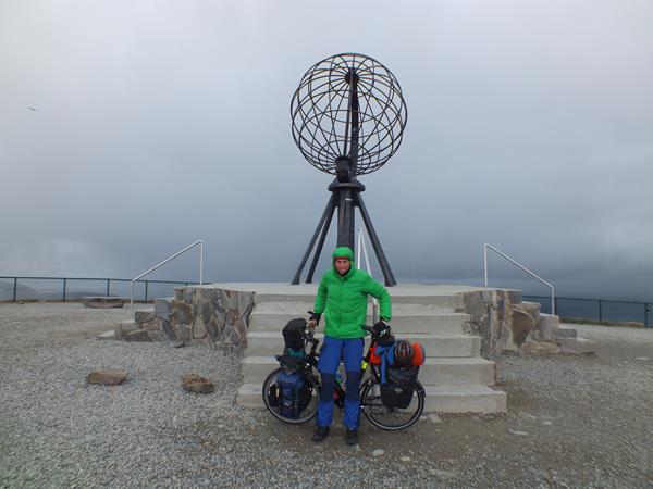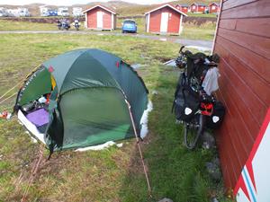 Für Radfahrer ist das Visitercenter kostenlos. Eine Motivation mit dem Rad hier oben anzukommen. Ich treffe Christoph, den Motorradfahrer vom Camping aus Kirkenes, wir besuchen die zwei Kordkapp 3-D Filmchen, trinken einen Kaffee zusammen und tauschen uns von der Strecke ein wenig aus. Auf meiner bevorstehenden Strecke gibt es also nicht viel Service in Sachen Camping und Einkaufsmöglichkeiten. Nach ca. 2h begebe ich mich in Richtung Süden. :-) Ab jetzt wird es wärmer. Auf dem kleinen nördlichsten Camping --> der Welt<-- kampiere ich. Noch beim Zeltaufbau zieht ein Schneeschauer auf und prüft meine Aufbaufähigkeit unter kalten stürmischen und unter stark Schneefall -Bedingungen-.