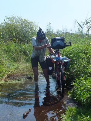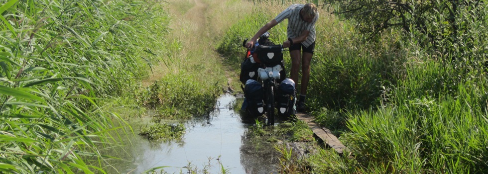 Engegenkommende Radler hatten uns empfohlen diesen Radweg nicht zu fahren. Es sollte Wasserlöcher geben die nicht umfahrbar sein. Trotzdem möchten wir an der Küste entlang diese Strecke fahren. Die ersten 2km sind noch einigermaßen befahrbar, d.h. Man muss nicht absteigen, dann wird der Radweg auf zwei Sand-Spuren in der Breite eines Autos begrenzt. Links und rechts des wegs ist ein ca. 3m breiter Wasserkanal. Kurz später ist es nur noch eine Spur. Ein Wanderweg mit Schilf links und rechts bildet hier den Radweg. Leider ist an der nächsten Passage der Weg ca. 1m niedriger, so dass ein kleiner See, große Pfütze mit ca. 30cm tiefe die zwei Kanäle der beiden Seiten verbindet. Um dort durchzukommen müssen die niedrigeren Fronttaschen separat hin-übertragen werden. Diese Stelle gemeistert wird der „Radweg“ eher noch schlechter.