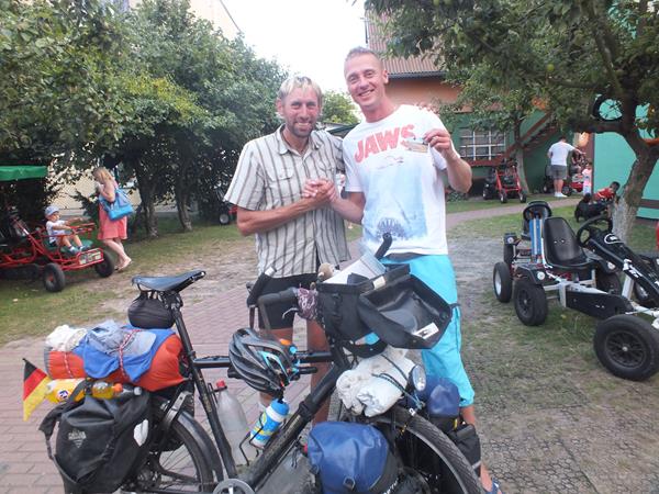 Am Abend kommen wir in den Ort Rowy und treffen auf Jendrej, der uns bei unserer Suche nach Benzin für den Kocher weiterhilft und uns etwas von seinen Vorräten aus dem Hütchen hinter seinen Haus gibt.