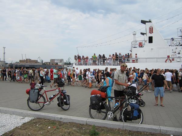 Nachdem Frühstücken mit viel Kaffee geht es zu zweit los, was für mich viel abwechslungsreicher und schöner ist zu radlen. Schon im nächsten Ort endet der gut ausgebaute Radweg am Meer. Es gibt weder keine Beschilderung noch weisen die Karten darauf hin wo es lang gehen soll. Die Räder müssen eine steile Treppe hinaufgeschoben werden. Wir fahren in den nächten Ort, wo wir die Fähre nach „Hel“ nehmen, die auf einer langen Landzunge liegt. Leider müssen wir erst noch 2h warten und dann die Taschen von dem Rad abgemachte werden, d.h. Das jeden mit min. vier Taschen zu Fuß auf die Fähre laufen muss.