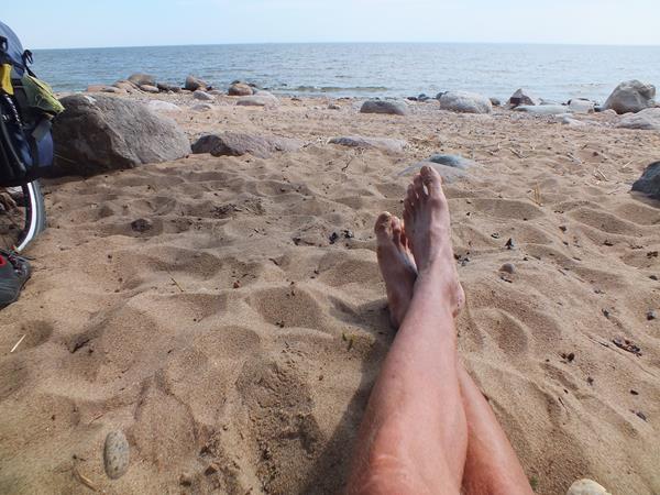 Dahinter verbirgt sich ein Alueimer befestigt an einer rostigen Kette, die zum Aufwickeln um einen Balken gewickelt wird. Ein klassicher Brunnen, ca. 500m von der Küste entfernt. Er hilft mit alle meine Flaschen zu füllen und geht wieder zur Arbeit zurück. Es sind schon wider mehr als 7 Liter Wasser am Rad, die ich sofort am nächsten Hügel merke. Da ich heute nicht gleich nach St Petersburg hineinfahren kann (ca. 60km), lasse ich es ruhig angehen und mache zahlreiche Stopps um auch die „Baltic sea“ mein Meilenstein zwischen der „Barent Sea“ und „Black sea“ zu genießen. Um Mittagszeit setzte ich mich unter Bäume am Strand, lesen und koche mir Mittagessen.