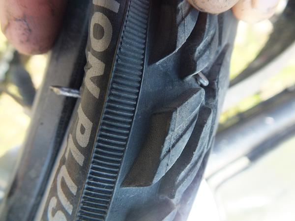 Glücklicherweise ist die Struktur nicht kaputt, sowie der Nagel zur Seite heraus und hat nicht die Felge berührt. Repariert ist es schnell.