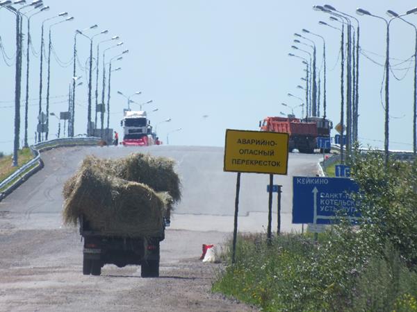... das erste Mal in Russland! Zunächst geht es zum kleinen Städtchen Vyborg, das mich nicht sehr beeindruckt und ich relativ schnell wieder weiterfahre, da es sehr ungepflegt ist. Da ich den LKWs etwas aus der Hauptverkehrsroute fahren möchte, entschließe ich auf kleineren Straßen Richtung St Petersburg zu fahren. Diese Straßen hatten in den letzten 20 Jahren keinerlei Reparatur genossen. So sind selbst Autos und kleine LKWs mit teilweise nur 20km/h unterwegs um den Schlaglöchern auszuweichen, eine gute Erfahrung.