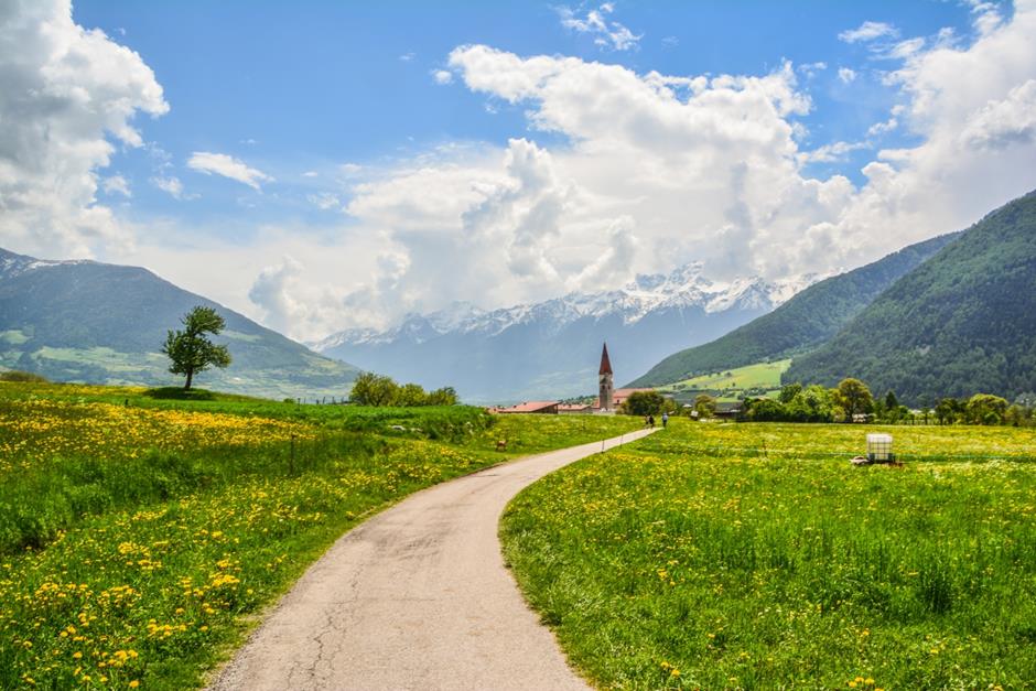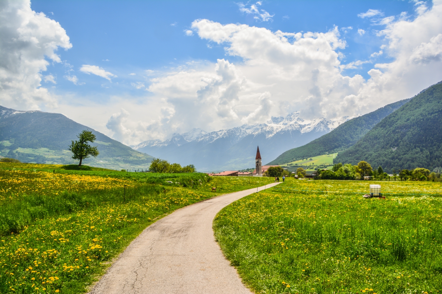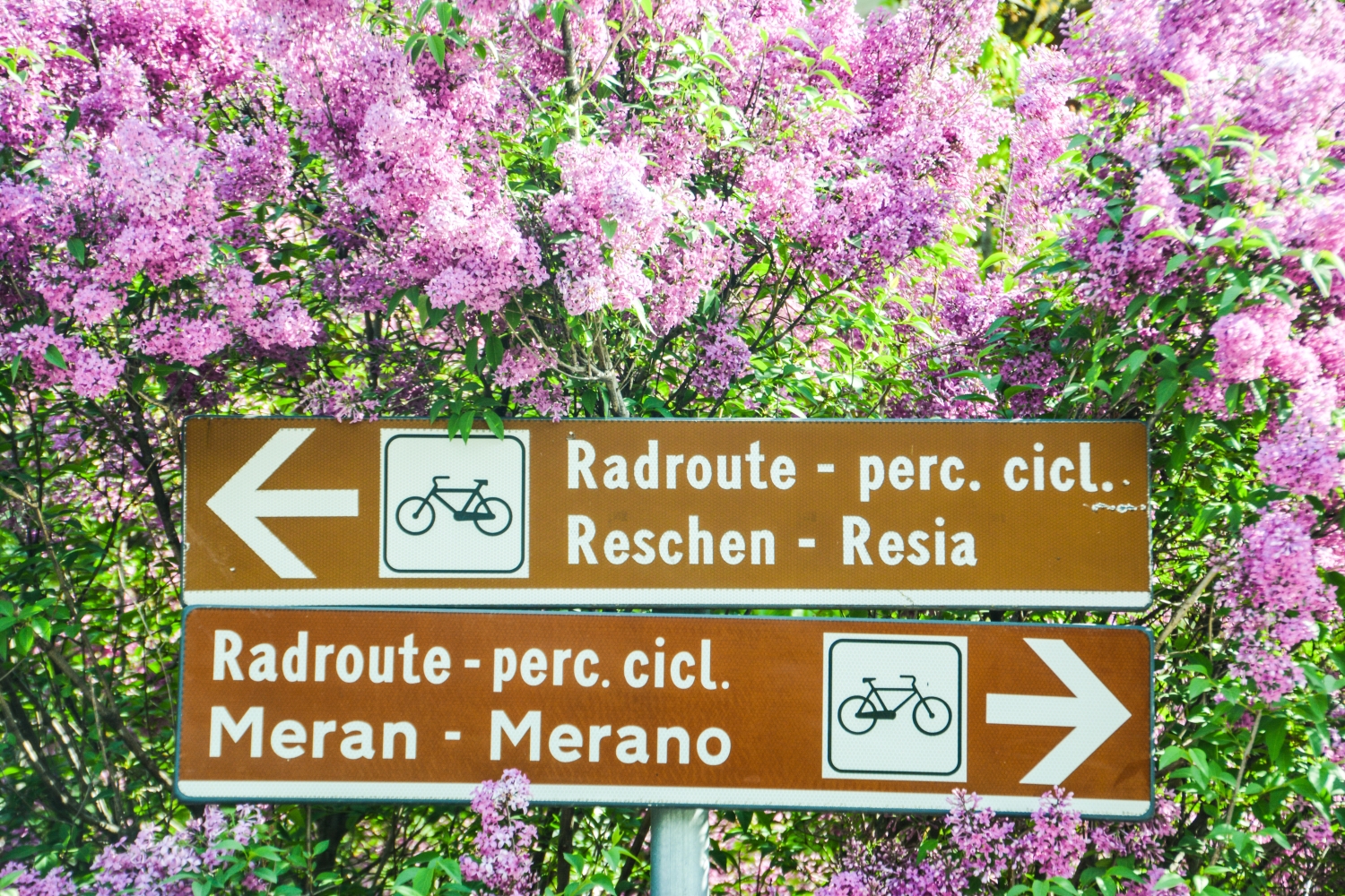 Andreas und Vittoria, die keine Weltreise per Fahrrad benötigen um fit zu sein, wollen uns am Sonntag für eine Tages Etappe begleiten. Darüber freuen wir uns natürlich riesig und das Wetter spielt auch noch mit. Es kann also losgehen. Nach wenigen Metern rollen wir bereits mit jeder Menge anderen Radlern auf dem perfekt ausgebauten Radweg Richtung Meran.