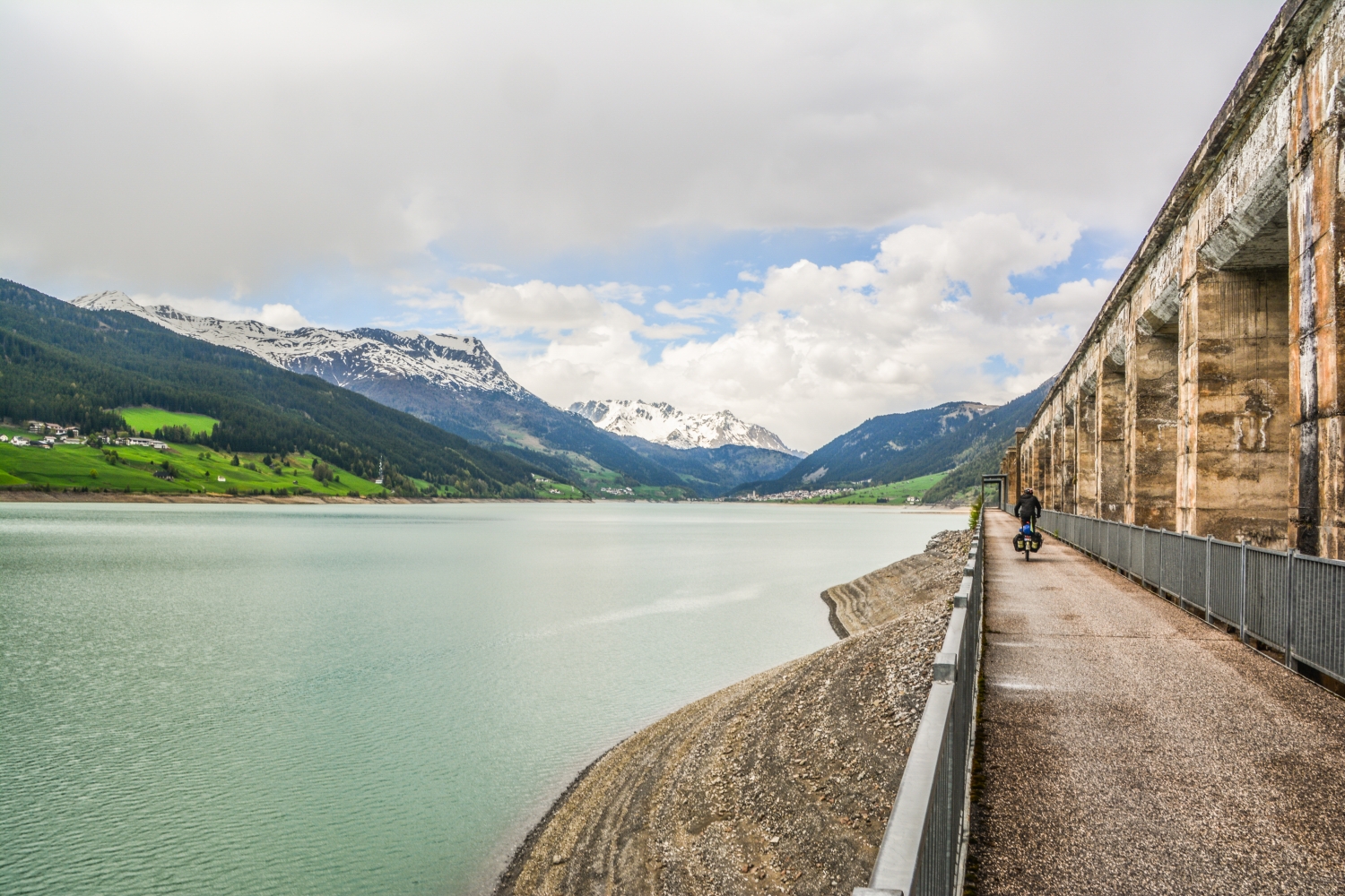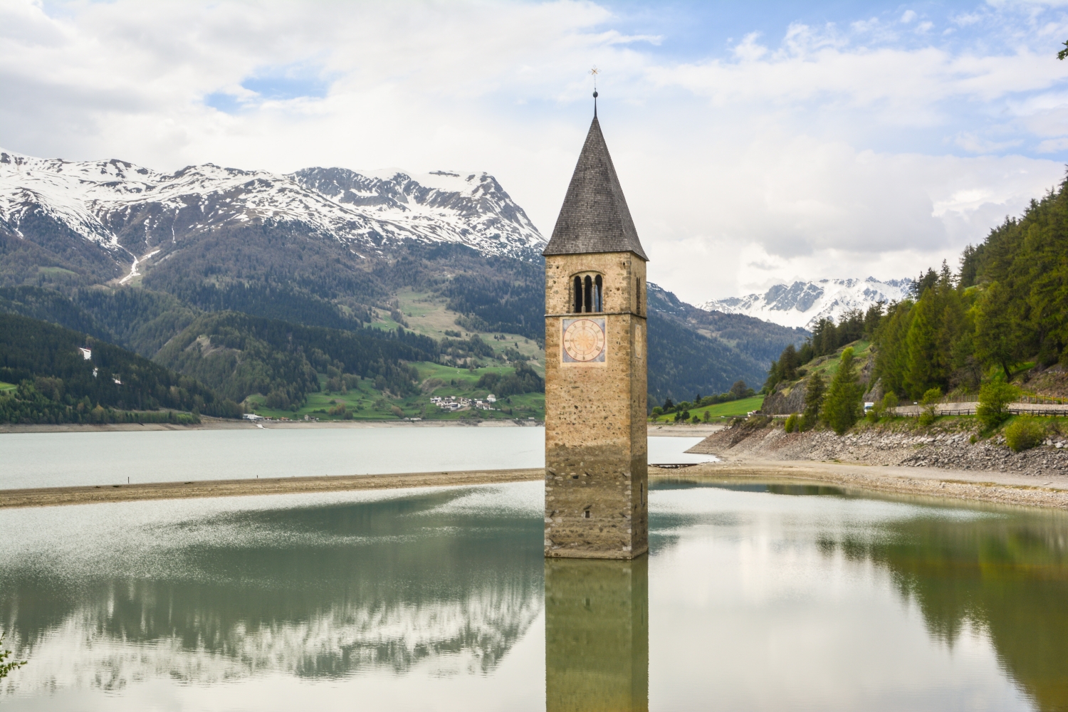 Die letzten 10 Kilometer vor der Grenze nach Österreich sind nahezu flach. Wir erreichen den Stausee und dessen bekanntes Wahrzeichen, den Glockenturm der ehemaligen Pfarrkirche St. Katharina. Der unter Denkmalschutz stehende Turm ist das einzige erhaltene Gebäude des ehemaligen Ortes. Alle anderen Häuser des Dorfes Graun wurden vor dem ersten Vollstau des Sees gesprengt.