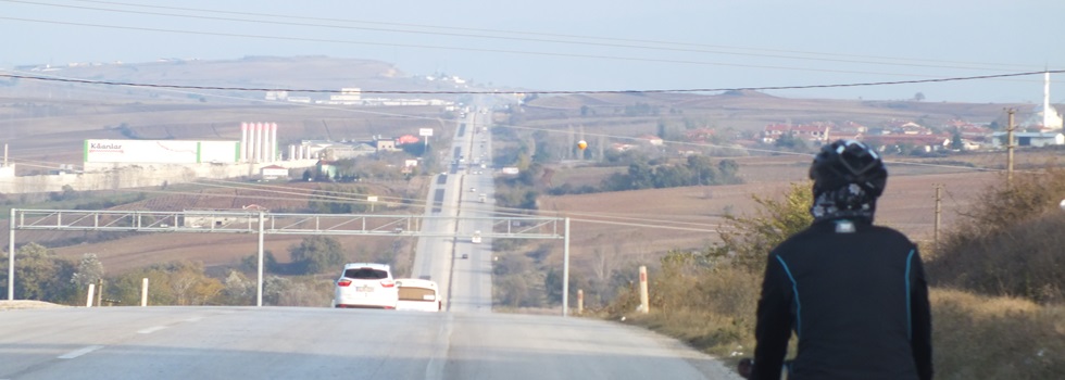 06.11.2014 Ipsala (TR) – Barri (TR) 64kmFrühstück ist bei dieser Unterkunft nicht inklusive, deshalb versuchen wir etwas lokales zu bekommen. Hühnersuppe mit Brot, Backwaren, türkischer Kaffee und ein Tee bilden die beste Energieversorgung zum Weiteradeln. Gleich geht es bergauf und auf der breiten Straße die nächsten 55km weiter. Immer-wieder geht es mit ca. 5% bergauf und bergab, wobei diese breite Straße wie ein Linien durch die Landschaft gezogen ist und schon kilometerweit die Straßenführung vorher deutlich zu sehen ist. Bald geht es rechts runter von der lärmenden Hauptverbindungsstraße nach Istanbul, da wir zu der Küstenstraße, die auf der Karte sehr interessant ausschaut, abbiegen möchten. Schon der erste Ort ist ser interessant, hier laufen Kühe Hühner und Hunde wild auf der Straße umher ohne sich großartig an den weniger Autos zu stören. An dem kommenden Hügel möchten wir uns ein schönen Platz suchen. Beim hinauf radeln stoppt ein kleiner Lieferwagen, fragt woher wir kommen, bevor ich überhaupt stoppen kann reicht der Fahrer eine türkische traditionelle Wurst aus dem Fenster. Genauso schnell wir er gestoppt hatte, war er auch wieder davon-gedüst.