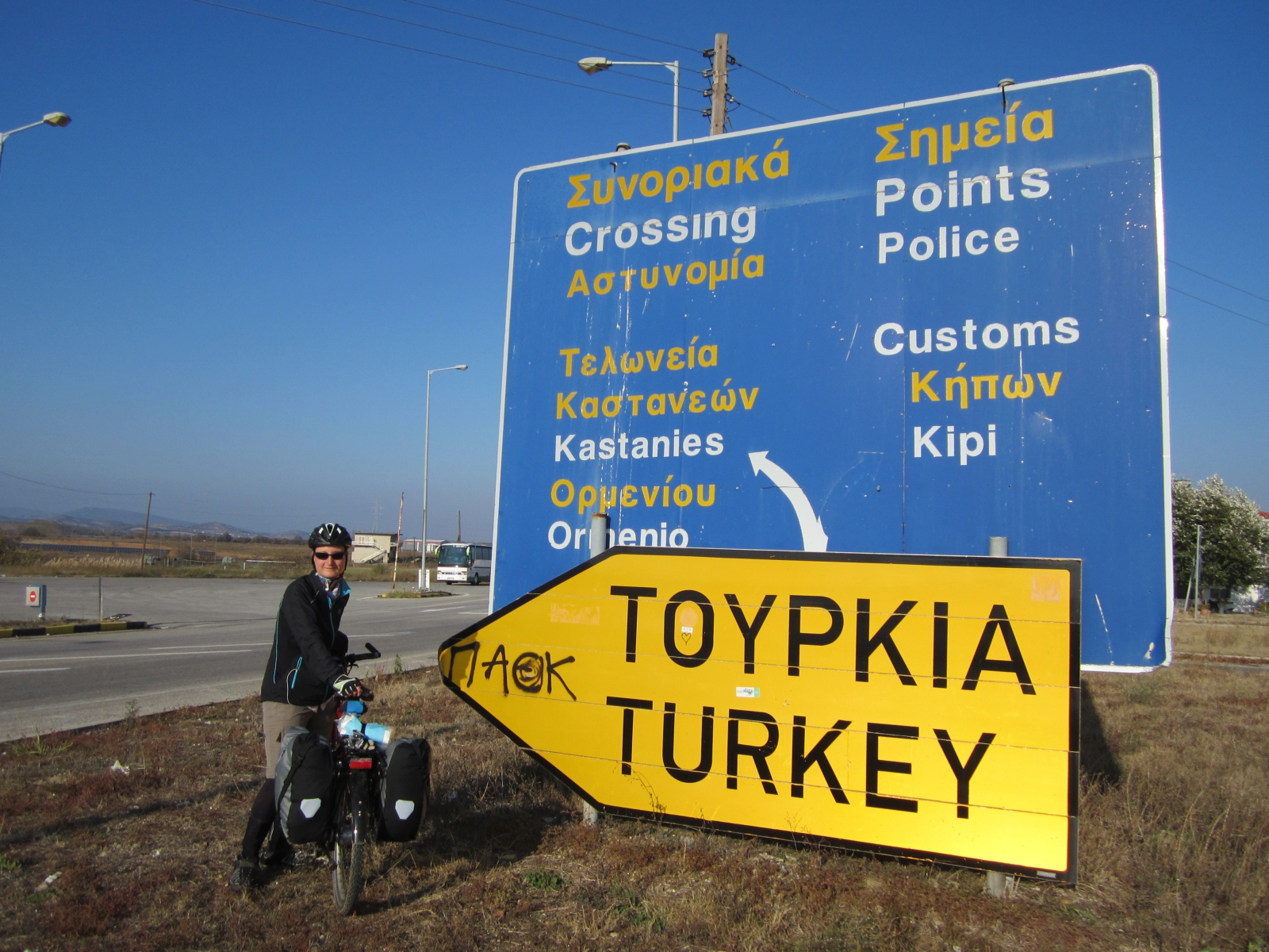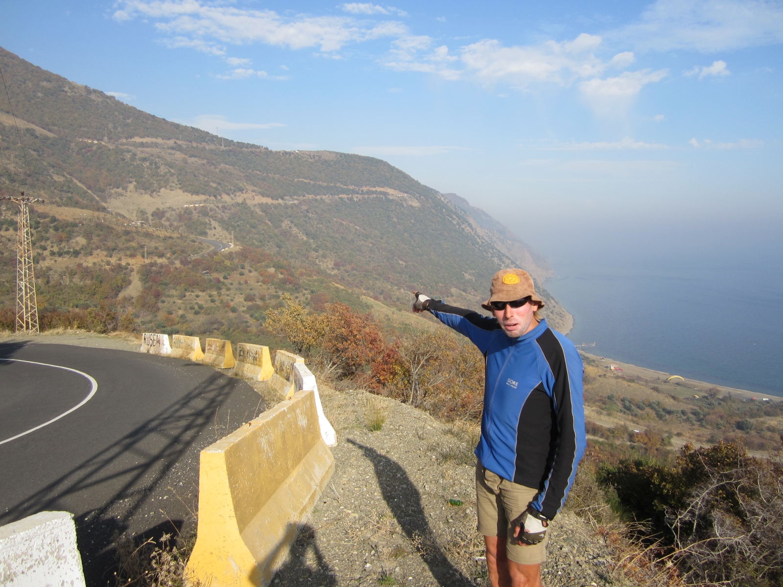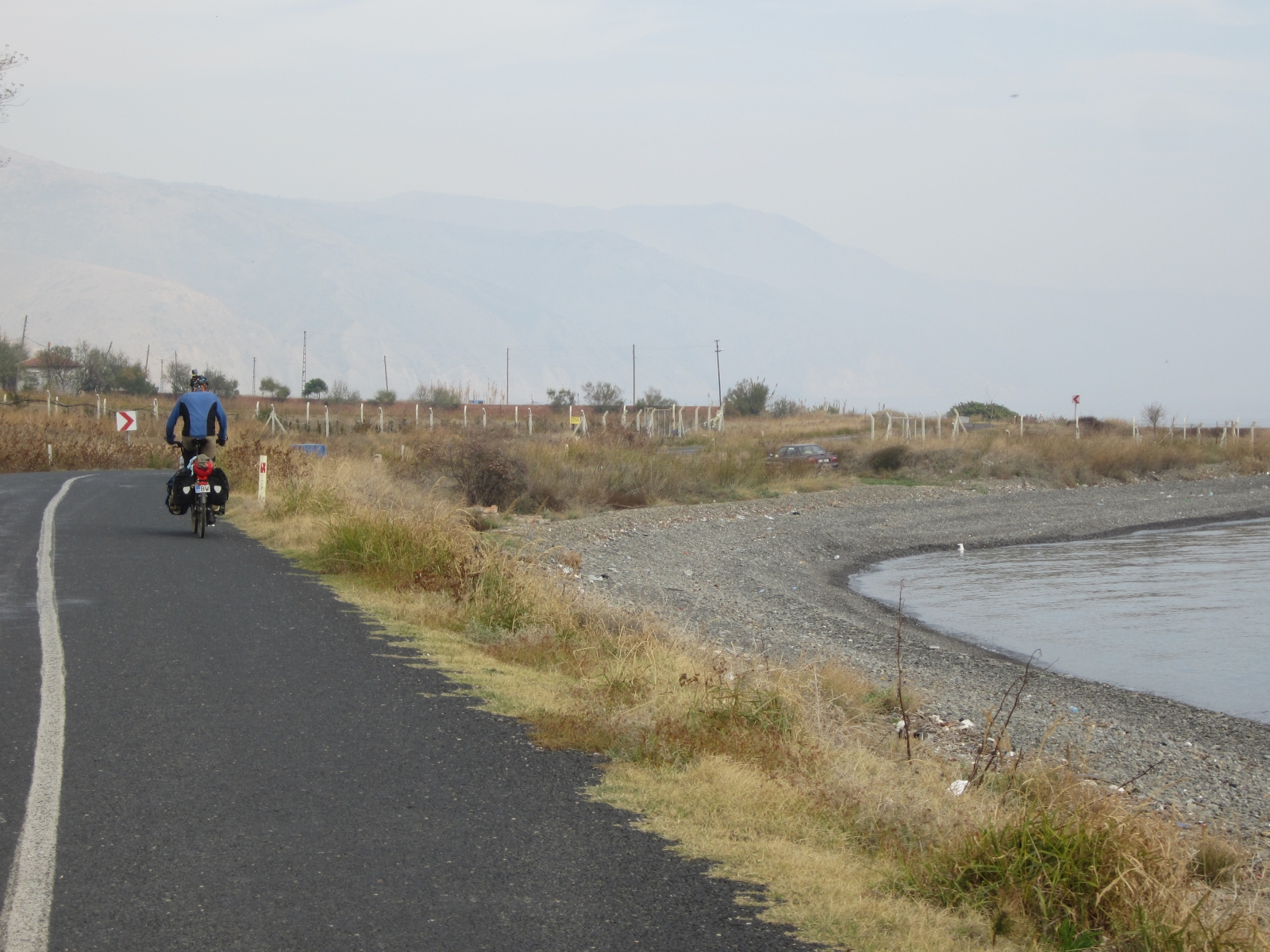 07.11.2014 Barri (TR) – Gaziköy(TR) 72kmNach einer ruhigen Nacht, abgesehen von dem Gesang der morgens um ca. 5uhr zum Gebet aufruft und von allen Lautsprechern installiert an jeder Moschee übertragen wird. Wahrscheinlich reine Gewohnheitssache. Nicht mehr weit ist es bis zur Küste. 10Km und noch mal 400hm hinauf. Dann geht es endlich hinab und ein kleiner touristischer Ort empfängt uns am Meer. Genauso wie ein älterer Mann, der uns sofort zu einem Kaffee eskortiert um uns zu einen Kaffee einzuladen. Sofort denk man an Erzählung anderer Reisende durch die Türkei, die darauf zu einer Unterkunft geführt werden. Es ist aber nicht so, ein Polizist in Ruhestand hat ein Eis-Kaffee am Ufer und bietet Radreisenden eine gratis Unterkunft an. Wir möchten heute noch etwas fahren und entschließen uns es nicht anzunehmen. Bis in die Dunkelheit fahren wir und erwischen noch eine super Unterkunft, gerade frisch renoviert in einem kleinen Ortschaft kurz vor Gaziköy. Im Hotel gitb es neben uns keine Gäste. Neben der Bar können wir unsere Räder parken und im Restaurant werden wir mit lokalem traditionellem Fisch verwöhnt. Neben uns sitzen zwei Türken, die 20 Jahre in Berlin gewohnt haben, so konnten wir mal wieder unser Deutsch anwenden. :-)
