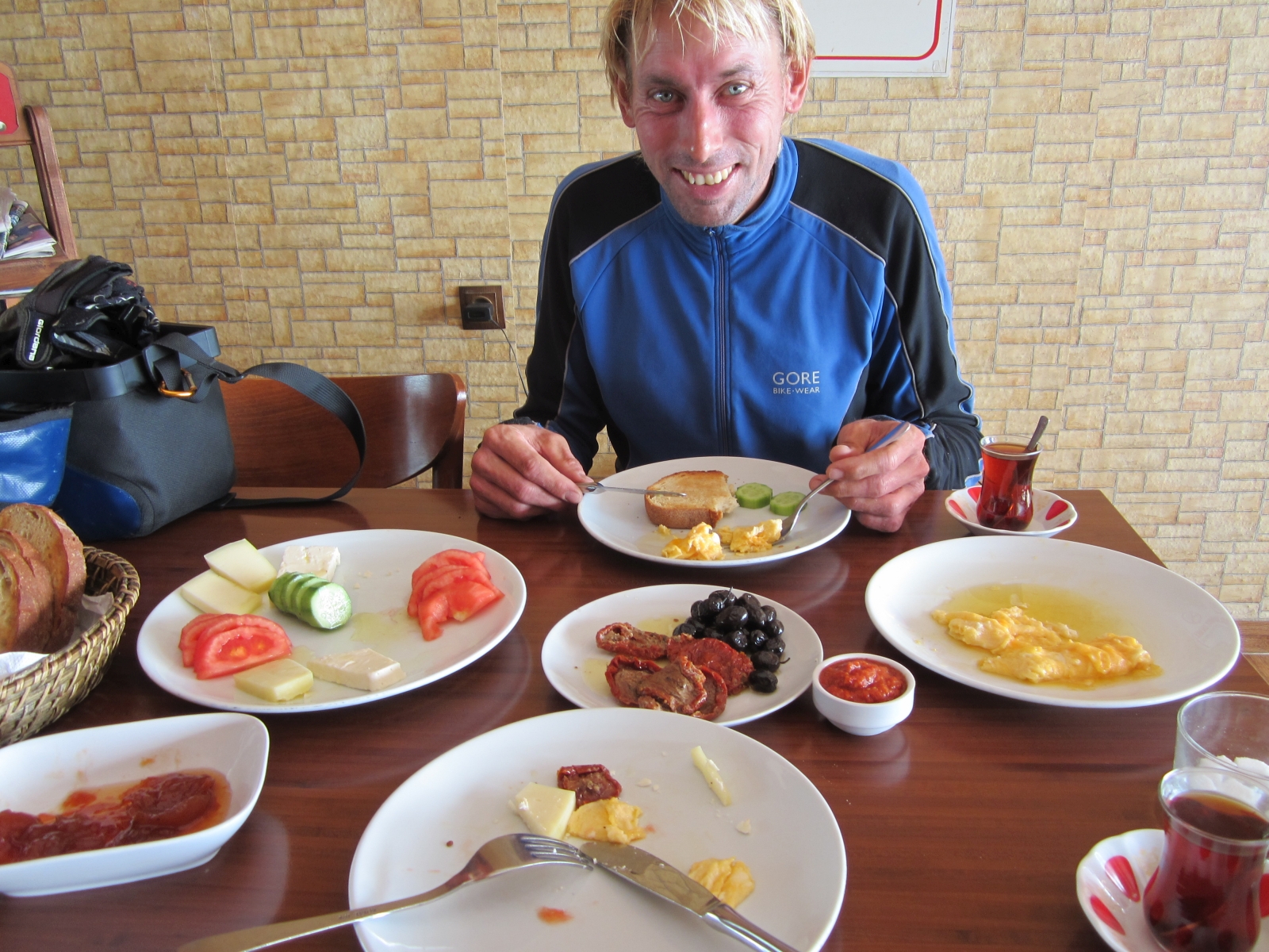 08.11.2014 Gaziköy(TR)– Steilküste bei Yeniköy 42kmGenauso wie das Abend-mal ist auch das Frühstück für nur 5Türkische Lira (2,3€) sehr schmackhaft und ausreichend, sogar für einen Radreisenden, der scon mehrere Monate im Sattel sitzt.